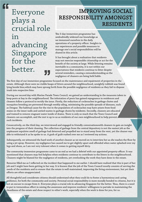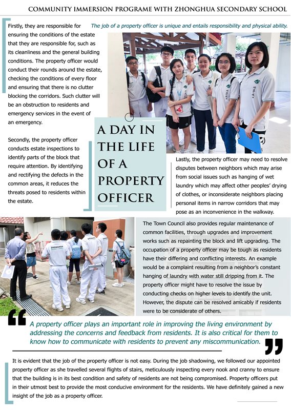 A group of students from Zhonghua Secondary School participated in the Community Immersion Programme held by our Town Council. The programme aimed to give students a career insight to estate management, and to also understand the social issues within the community.